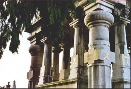 De zuilen die zich aan de buitenzijde bevinden van de graftombe zijn voorstellingen van essentiële begrippen uit de godsdiensten van vele culturen telkens in hun eigen taal :