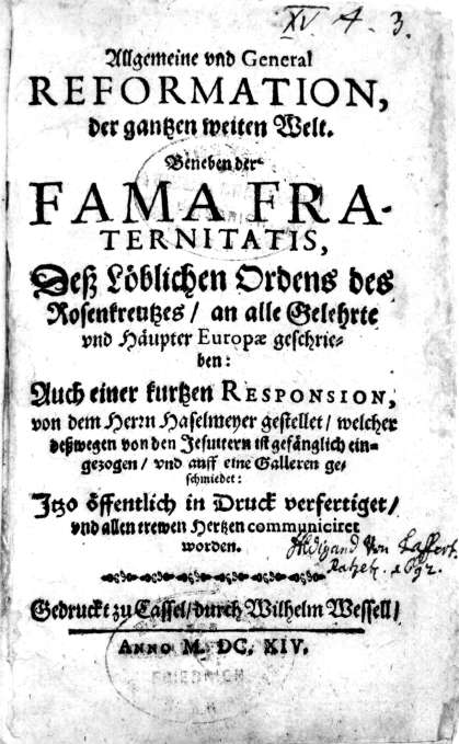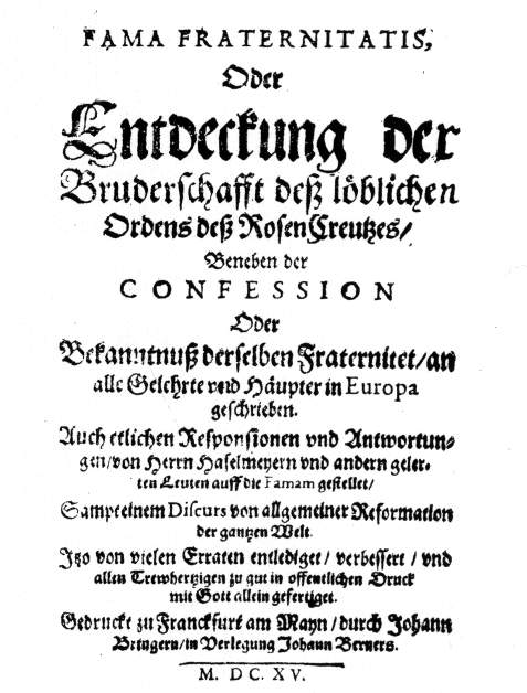 De Orde van het Rozenkruis of Rozekruisersorde maakte haar bestaan bekend te Kassel in 1614 met de Fama Fraternitatis, dess L�blichen Ordens des Rosenkreutzes. Het manuscript werd in 1615 gevolgd door de Confessio Fraternitatis eveneens uitgegeven te Kassel door Wilhelm Wessel.