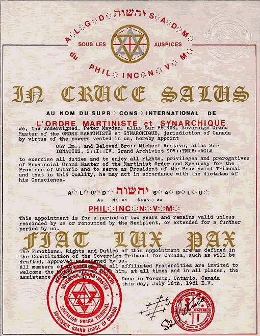justification from the Sovereign Grand Masters of the Orders Martinist